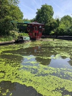 Now we had reached Cumberland Basin in Regents Park. Here the Regents Canal takes a sharp turn towards the Camden Locks. In the Cumberland Basin a Chinese Restaurant Feng Shang is moored. It was such a surprise to suddenly come upon this red building. The red was striking amongst the greens. There were some unsavory characters hanging around protesting something or other on the towpath. We rushed forward.
