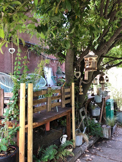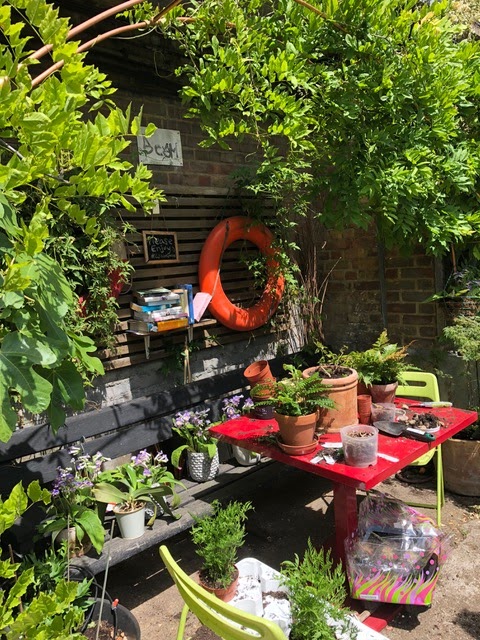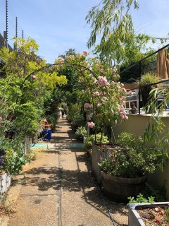 Our walk continued. We met a young woman who has developed a little reading nook with books and all, outside her houseboat on the Canal. She wants you to take a moment, stop and enjoy it all! She was still in the process of planting to get her nook ready for the summer.