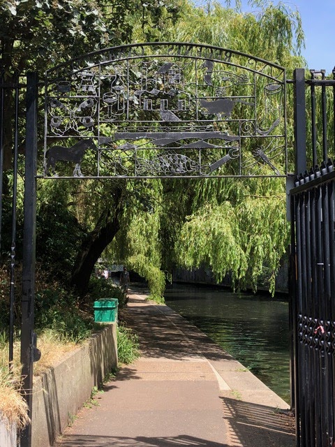 Suddenly the houseboats of Lisson grove were behind us. We entered Regent Park through this cast iron gate. The weeping willow trees lined the Canal towpath. Their lush green branches were kissing the water surface here and there.