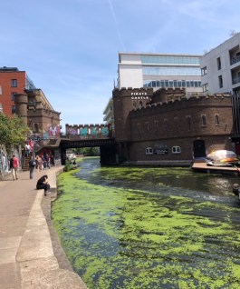We were reaching the final part of our walk. We were nearing the famous Camden Locks. The first sign of that came with this building. The Pirate Castle is a non profit organization that teaches all sorts of water activities for children on the Canal in Camden Town. This iconic building was built by architect Richard Seifert who has built lot of London buildings. We were amazed at the sight of this folly like building. While I was researching our walk I had read about it and had seen pictures of it too. But was still surprised at this building and the connecting bridge over the Canal built in the same style. Now the bridge is covered in Graffiti. Well it warned us of the kind of cultural hub that is Camden Town. #Camden Town.