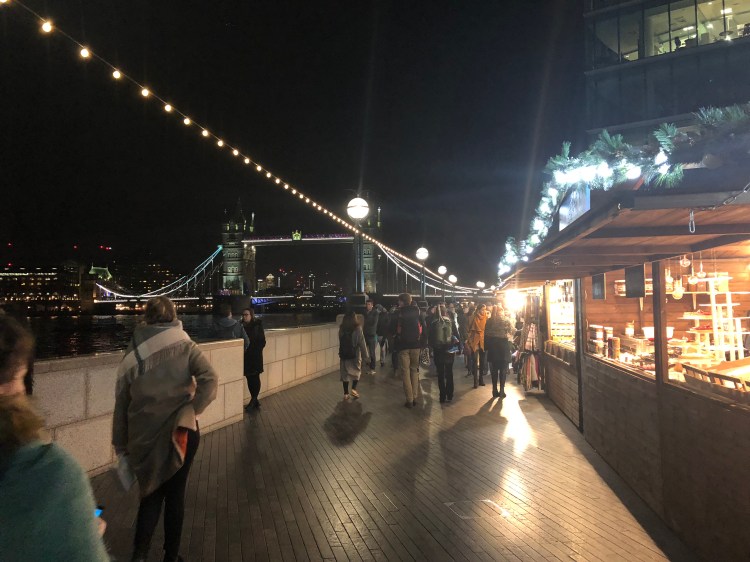 I am including some pictures of the Christmas bazaars. The food was the best part of attending these bazaars. Okay, ooey gooey chocolate dripping from my marshmallows and strawberry s’mores-on-sticks or Dutch pancakes smothered in Nutella were totally worth removing my hands from my gloves. I noticed that most of the stalls across the Christmas bazaars were the same. They were selling similar products. But the first couple of times to go out at night and walk in the cold checking out the stalls, laughing like little kids with a mouthful of hot chocolate sauce or just absorbing the atmosphere and the spirit of the season was an absolute delight. I would definitely recommend it. Do at least one market at night. We went to quite a few but my favorite probably was the one between Tower Bridge and London Bridge on the Thames. Generally the stalls were made to look like log cabins or Swiss chalets.