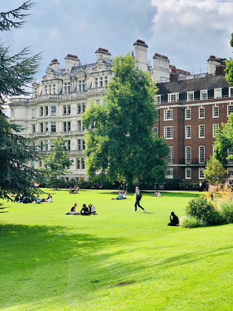 After entering the gate, I walked onto Middle Temple Lane. I turned towards the Inner Temple Garden. The gardens were beautiful with flowers, tall hedges, and green grass. On that summer day, the sun was shining and it was lunch time. The Inner Temple Garden was bustling with people. Give London a beautiful sunny day and all will make a beeline to a green space!