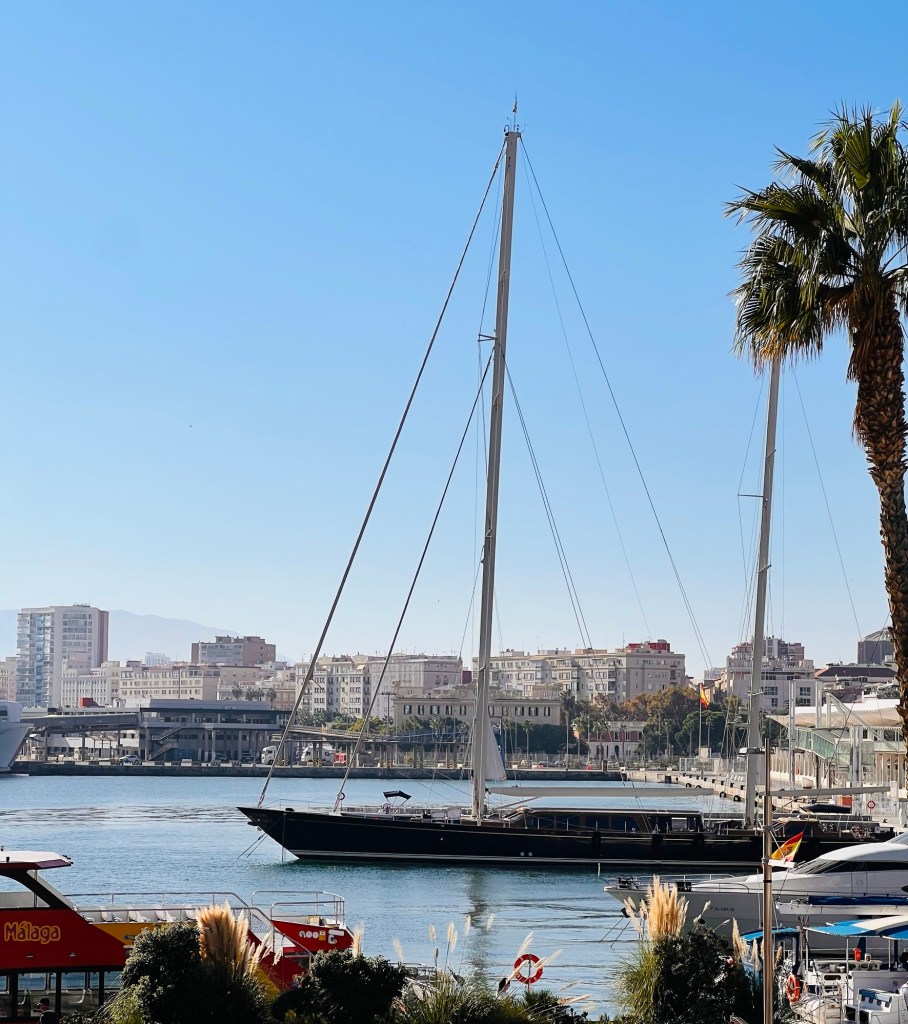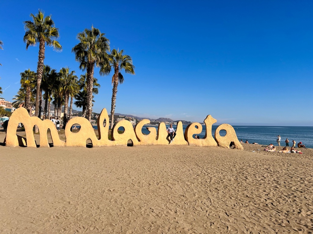 We collected our rental car and set out to explore the city. As soon as we came out of airport parking, we were amazed at the avenues and streets bordered by orange trees laden with fruits. The streets were very narrow, so we were glad we listened to the advice of locals and rented a smaller car. We made our way to Playa de la Malagueta beach and the famous Malaga sign. We wanted to check out Malaga’s famous yellow beaches and the coast first. After the fresh sea air, we were more than ready for lunch and headed to a rooftop restaurant near the harbor. With the sea shimmering on one side and the Centre Pompidou Malaga and Castillo de Gibralfaro on the other, we enjoyed the sunlight and blue skies.