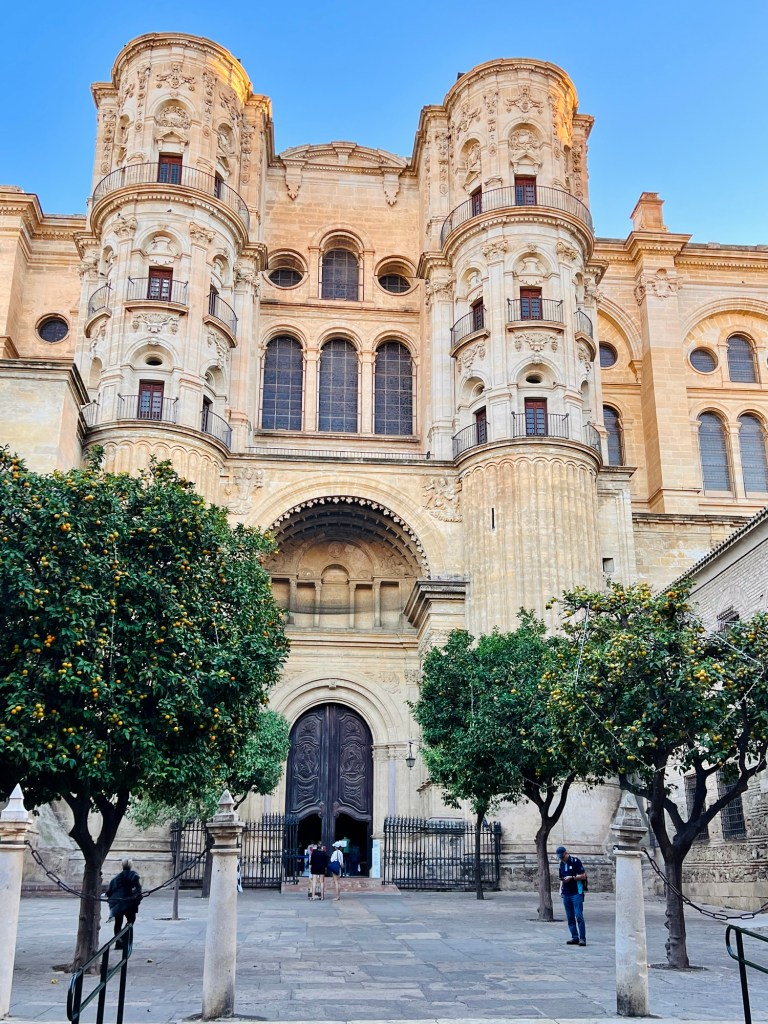 The Cathedral was built on top of a Moorish Mosque between the 16th and 18th centuries in the Renaissance and Baroque styles of architecture. Its south facade and one tower are not finished. Visitors can climb 200 steps to visit the top of the tower, but we decided to forego a tower visit. The ticket to visit the Cathedral is €10. The approach to the Cathedral door is flanked by the ever-present orange trees. The courtyard garden is lovely and the interior of the Cathedral is absolutely beautiful. The choir stalls are carved out of cedar and are lovely.