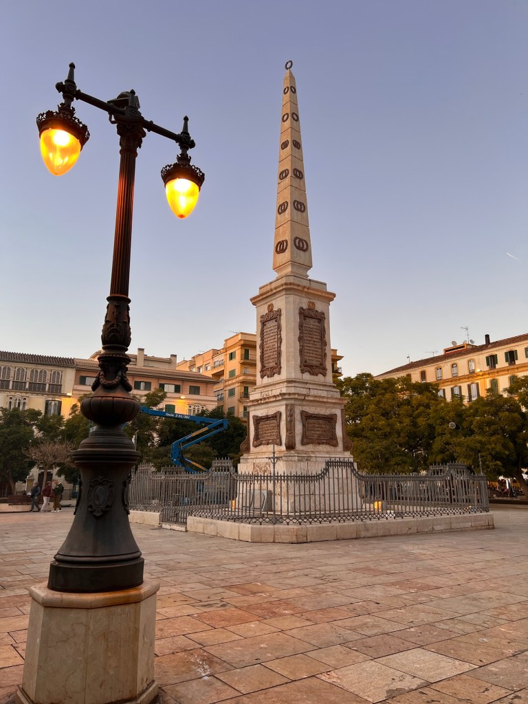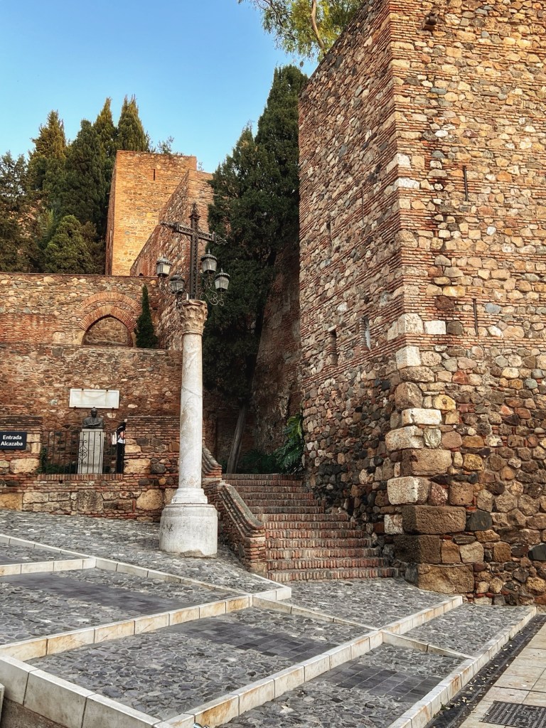 After the Cathedral, we made our way to Alcazaba, a Moorish Citadel or a fortress in the middle of town. It was built on Roman ruins in AD 756. There is a massive Roman Theatre at the bottom. The fortress is situated on the top of a hill. We quickly visited it from the outside as we were planning to see Alcazaba-like buildings in other cities. By the time we came out the moon was rising, and the evening shadows were getting longer. We settled in Plaza de La Merced with our paper cone of hot chestnuts to watch the city lights turn on.