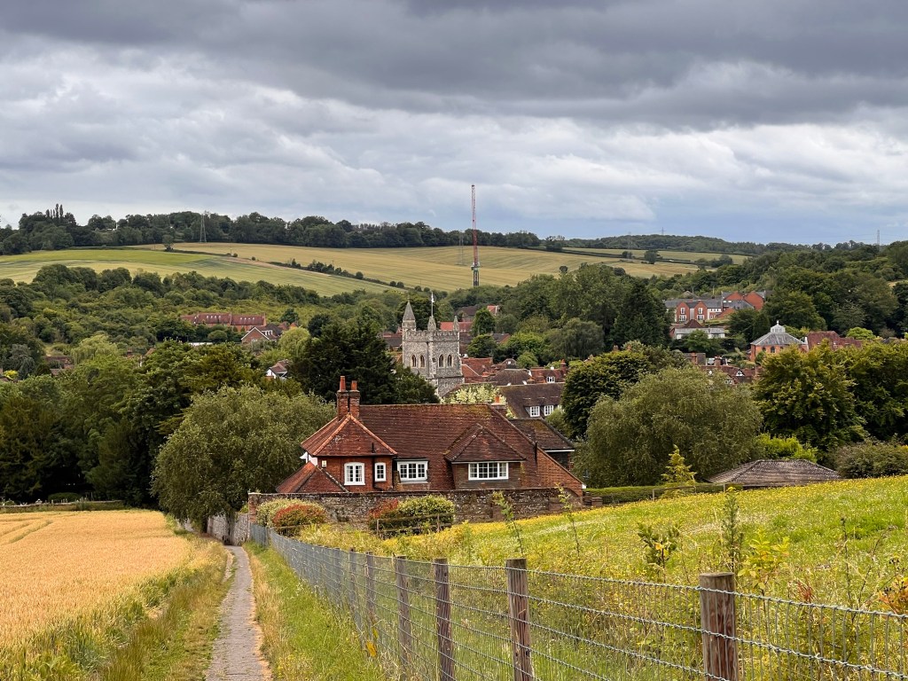 This area is famous for many walks through the countryside. That was what we wanted to do. We set out on the walk after getting off the train on a mostly cloudy day. The prediction was for the sun to pop out from behind its dark veil once in a while and for it to completely show its face by early afternoon. We hoped it would be sooner than later. It had been raining the previous day so we knew the countryside would be muddy. The Rectory Path passes through thick woods known as Parsonage Woods. The path, as we expected, was rain soaked. We squelched through the dark woods trying to avoid the muddy patches. We thought we were lost as the woods were dense. But the good thing was we could see a road running parallel to the woods from the break in the trees. I had read about the view of Old Amersham from the top of a hill to down below. Suddenly, we came out of the woods and onto the top of a rolling hill. There it was, down below the Old Town of Amersham. This view was exactly as I had seen in pictures. We soaked in the view of the English countryside with the church spire and rooftops jutting out from between trees. On our left the hill was covered with a wheat farm.