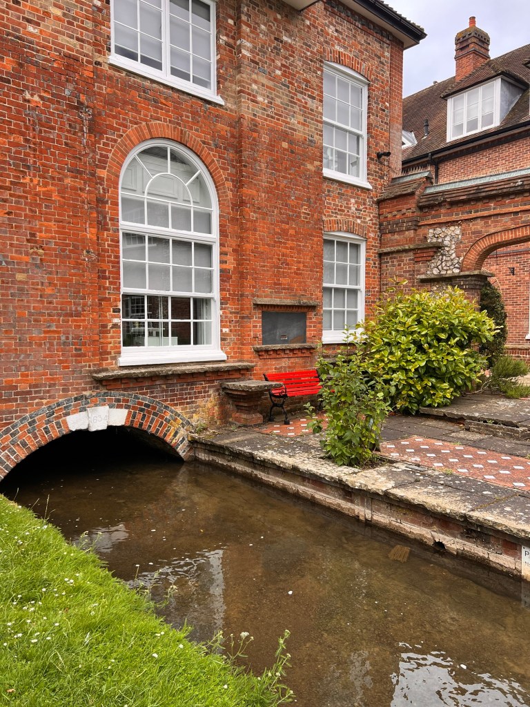 We decided to catch up with the Misbourne River. We caught up with it behind Amersham Methodist Church. It flows behind the buildings on High Street. I wanted to see the Misbourne flowing from below a building, so we walked via Church Street to St. Mary’s Church. The path next to the church takes you to old Wellers Brewery. The Brewery is now a badminton court. The Misbourne flows below the Brewery. It was a surprise to see this narrow river flowing merrily through the arched opening below the building. We followed the Misbourne back to the Memorial Garden to get back on High Street. A local resident had recommended lunch at The Grocer at 15. The Grocer was a charming little place with low ceilings and an open kitchen. After a long morning of walking through the town and the countryside, we sat down for a delicious late lunch. We had wonderful potato and leek soup with a halloumi, avocado, and tomato chutney sandwich. The food was hot, fresh, and tasty. A great thing about traveling in England is the choice of food for vegetarians.